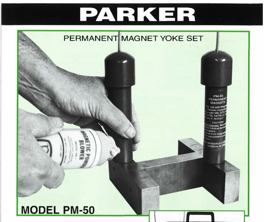 Parker permanent magnetic yokes are designed with a flexible coated steel cable that allows a maximum leg span of 12”. The permanent magnets are protected by a Durable plastic housing. Model PM50 produces a strong magnetic field exceeding a 50 lb. weight lift strength.